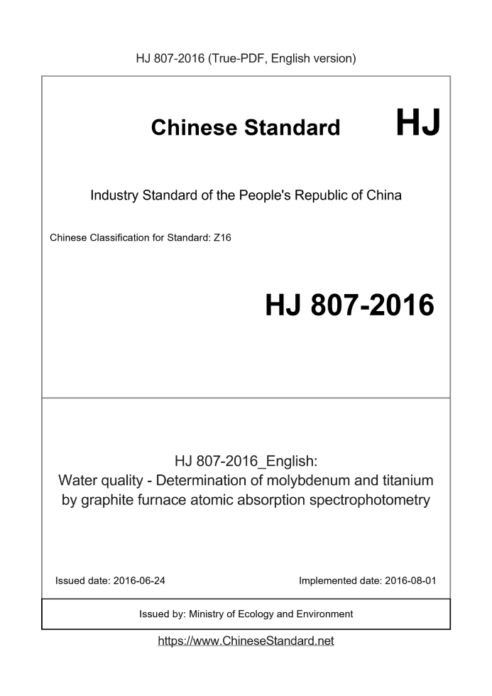 Delivery: <= 3 days. True-PDF full-copy in English will be manually translated and delivered via email. HJ 807-2016: Water quality - Determination of molybdenum and titanium by graphite furnace atomic absorption spectrophotometry Status: Valid