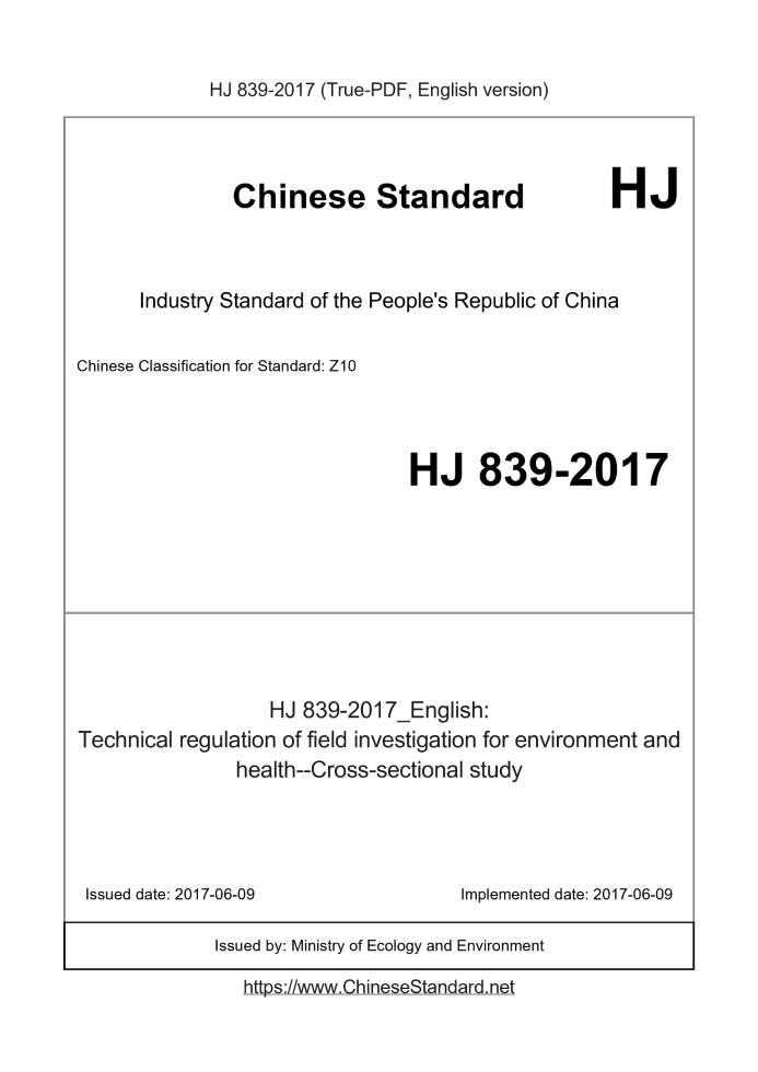 Delivery: <= 3 days. True-PDF full-copy in English will be manually translated and delivered via email. HJ 839-2017: Technical regulation of field investigation for environment and health--Cross-sectional study Status: Valid