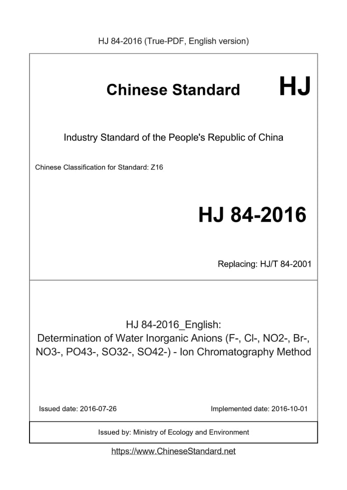 Delivery: <= 3 days. True-PDF full-copy in English will be manually translated and delivered via email. HJ 84-2016: Determination of Water Inorganic Anions (F-, Cl-, NO2-, Br-, NO3-, PO43-, SO32-, SO42-) - Ion Chromatography Method Status: Valid HJ 84: Historical versions
