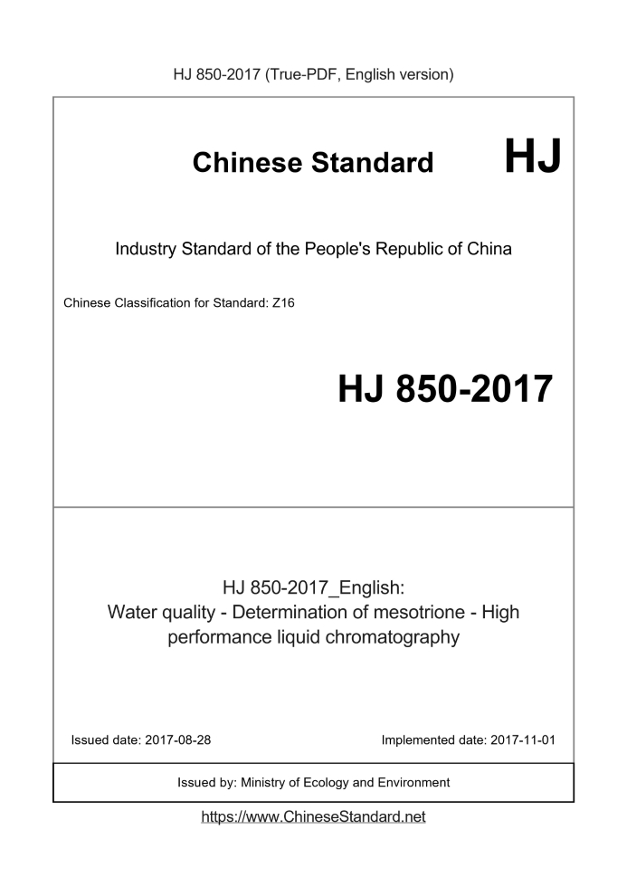 Delivery: <= 3 days. True-PDF full-copy in English will be manually translated and delivered via email. HJ 850-2017: Water quality - Determination of mesotrione - High performance liquid chromatography Status: Valid