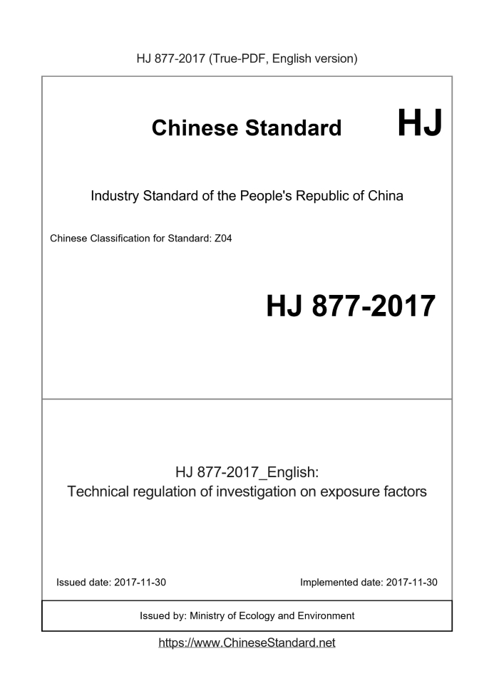 Delivery: <= 3 days. True-PDF full-copy in English will be manually translated and delivered via email. HJ 877-2017: Technical regulation of investigation on exposure factors Status: Valid