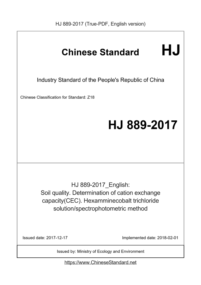 Delivery: <= 3 days. True-PDF full-copy in English will be manually translated and delivered via email. HJ 889-2017: Soil quality. Determination of cation exchange capacity(CEC). Hexamminecobalt trichloride solution/spectrophotometric method Status: Valid