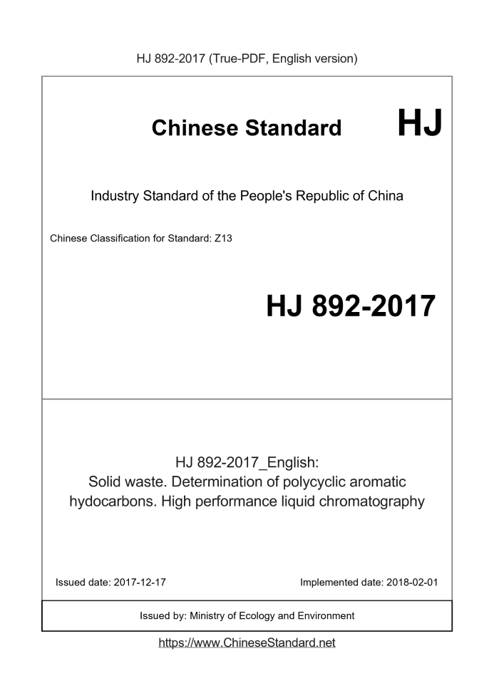 Delivery: <= 4 days. True-PDF full-copy in English will be manually translated and delivered via email. HJ 892-2017: Solid waste. Determination of polycyclic aromatic hydocarbons. High performance liquid chromatography Status: Valid