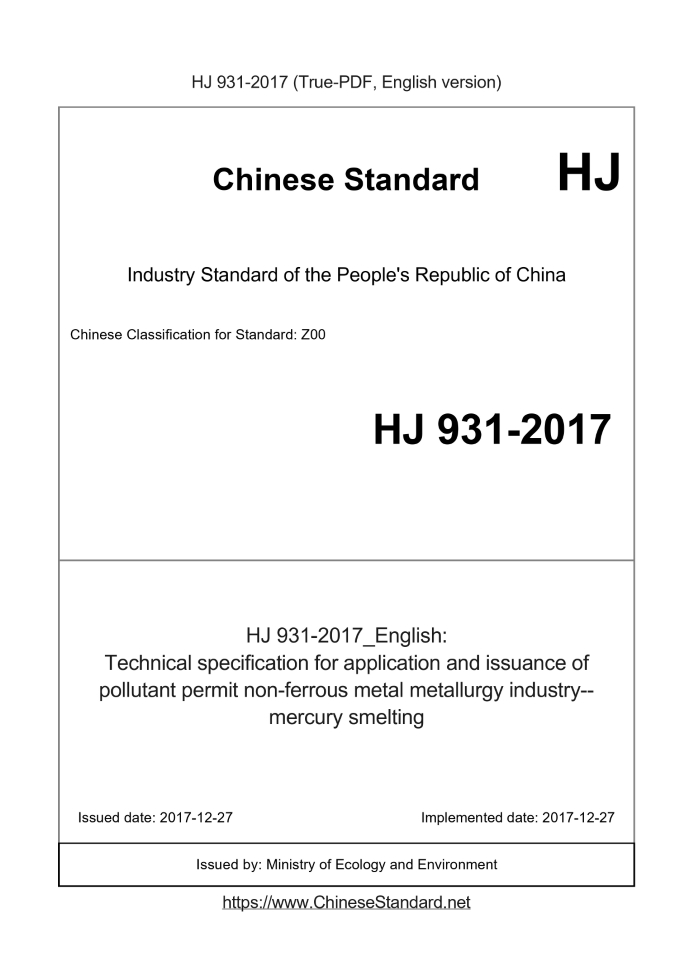 Delivery: <= 7 days. True-PDF full-copy in English will be manually translated and delivered via email. HJ 931-2017: Technical specification for application and issuance of pollutant permit non-ferrous metal metallurgy industry--mercury smelting Status: Valid