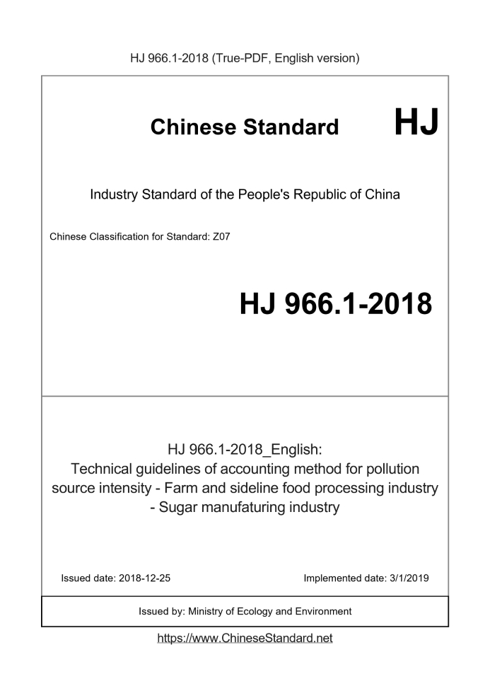 Delivery: <= 5 days. True-PDF full-copy in English will be manually translated and delivered via email. HJ 966.1-2018: Technical guidelines of accounting method for pollution source intensity - Farm and sideline food processing industry - Sugar manufaturing industry HJ 966.1: Historical versions