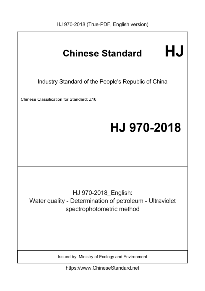 Delivery: <= 3 days. True-PDF full-copy in English will be manually translated and delivered via email. HJ 970-2018: Water quality - Determination of petroleum - Ultraviolet spectrophotometric method Status: Valid