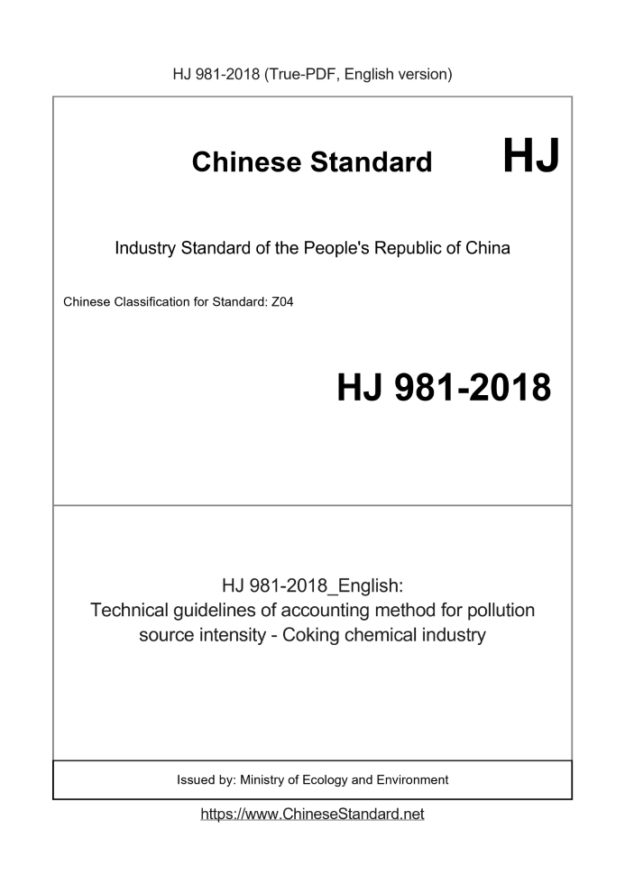 Delivery: <= 5 days. True-PDF full-copy in English will be manually translated and delivered via email. HJ 981-2018: Technical guidelines of accounting method for pollution source intensity - Coking chemical industry Status: Valid