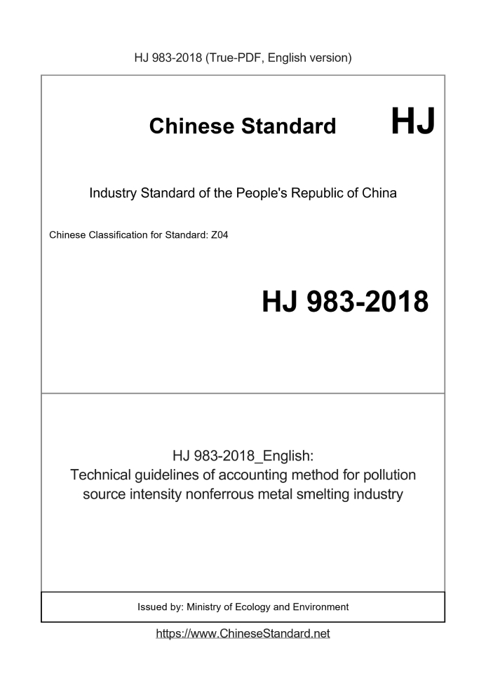 Delivery: <= 7 days. True-PDF full-copy in English will be manually translated and delivered via email. HJ 983-2018: Technical guidelines of accounting method for pollution source intensity nonferrous metal smelting industry Status: Valid