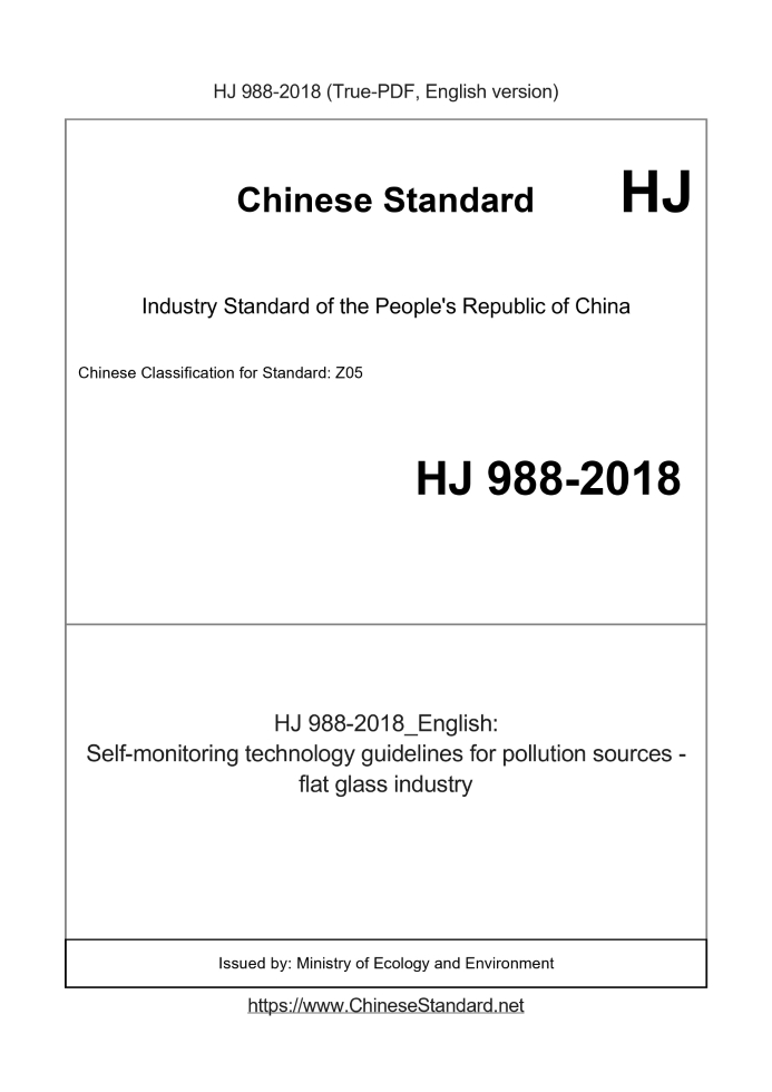 Delivery: <= 3 days. True-PDF full-copy in English will be manually translated and delivered via email. HJ 988-2018: Self-monitoring technology guidelines for pollution sources - flat glass industry Status: Valid