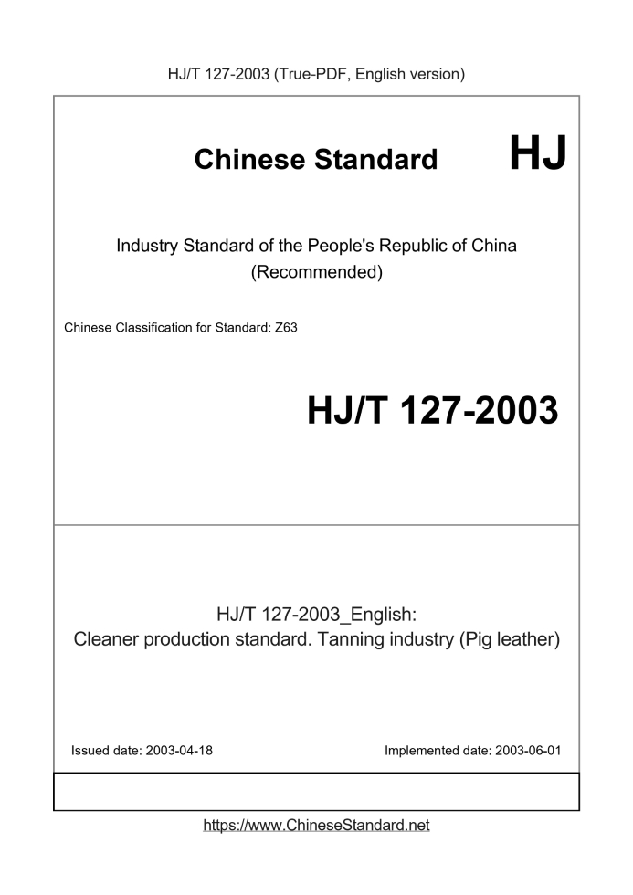 Delivery: <= 3 days. True-PDF full-copy in English will be manually translated and delivered via email. HJ/T 127-2003: Cleaner production standard. Tanning industry (Pig leather) Status: Valid