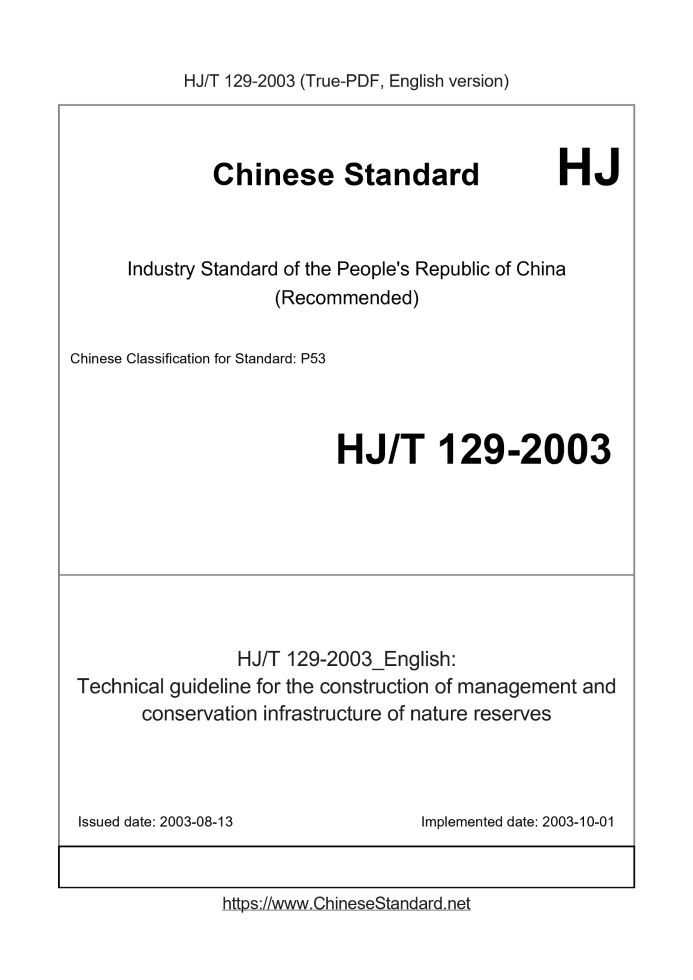 Delivery: <= 3 days. True-PDF full-copy in English will be manually translated and delivered via email. HJ/T 129-2003: Technical guideline for the construction of management and conservation infrastructure of nature reserves Status: Valid