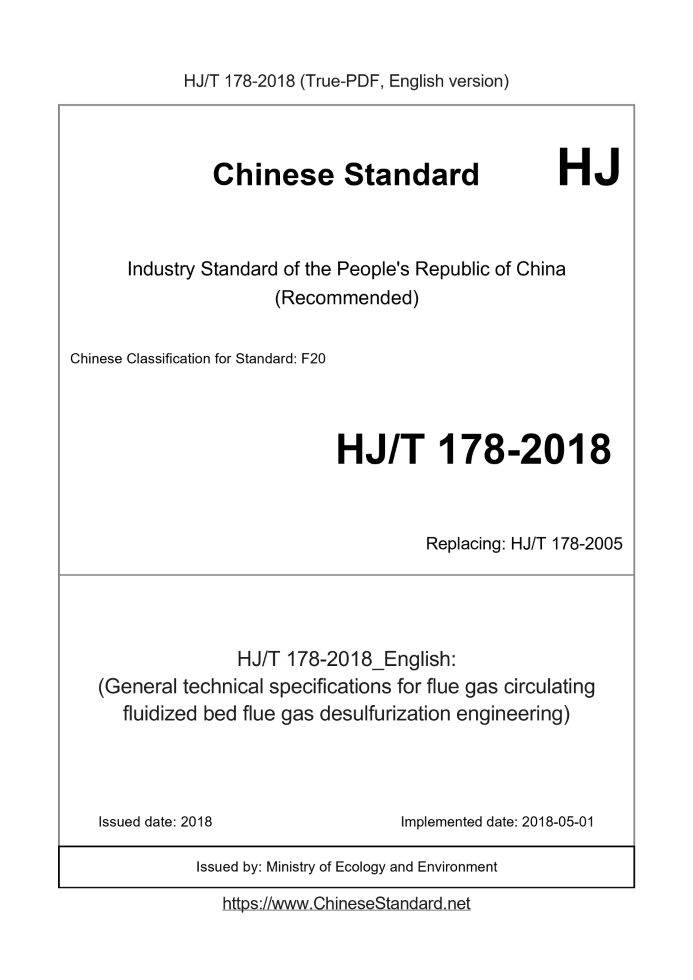 Delivery: <= 5 days. True-PDF full-copy in English will be manually translated and delivered via email. HJ/T 178-2018: (General technical specifications for flue gas circulating fluidized bed flue gas desulfurization engineering) Status: Valid HJ/T 178: Historical versions