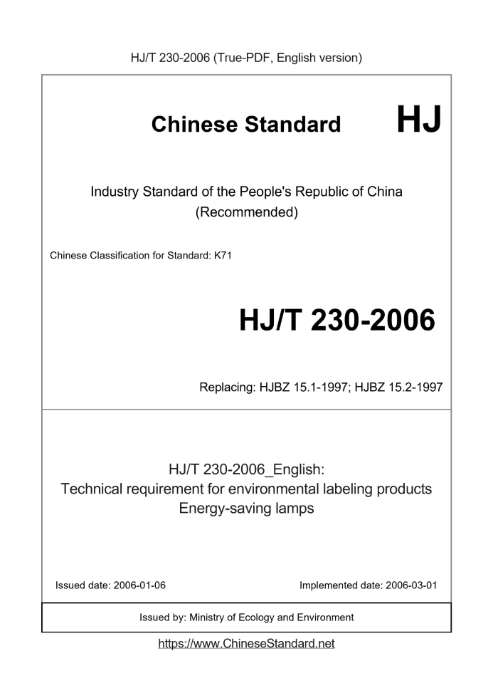 Basic dataStandard ID: HJ/T 230-2006 (HJ/T230-2006)Description (Translated English): Technical requirement for environmental labeling products Energy-saving lamps Sector / Industry: Environmental Protection Industry Standard (Recommended) Classification of Chinese Standard: K71 Classification of International Standard: 29.140 Word Count Estimation: 7,777 Date of Issue: 2006-01-06 Date of Implementation: 2006-03-01 Older Standard (superseded by this standard): HJBZ 15.1-1997; HJBZ 15.2-1997 Quoted Standard: GB/T 10682; GB/T 13259; GB/T 17262; GB/T 17263; GB 19043-2003; GB 19044-2003; GB 19415-2003; GB 19573-2004 Regulation (derived from): State Environmental Protection Administration Notice 2006 No. 1; Ministry of Environmental Protection Notice No. 38 of 2012 Issuing agency(ies): Ministry of Ecology and Environment Summary: This standard specifies the energy-saving lamps definition of eco-labeled products, basic requirements, technical contents and test method. This standard applies to the following products: double capped fluorescent lamps for general lighting: nominal power in the range of 14 ~ 65W, AC power frequency band starter preheat cathode fluorescent lamps and high frequency double-ended working cathode preheating double capped fluorescent lamps. General self-ballasted fluorescent lighting: Rated voltage 220V, frequency 50Hz AC power, rated at 60W and below, using screw or bayonet cap for domestic and similar general lighting purposes, control startup and stable ignition components integrated into the self-ballasted fluorescent lamps. This standard does not apply with self-ballasted fluorescent hood. Tips & Frequently Asked Questions:Question 1: How long will the true-PDF of HJ/T 230-2006_English be delivered?Answer: Upon your order, we will start to translate HJ/T 230-2006_English as soon as possible, and keep you informed of the progress. The lead time is typically in 9 seconds (download/delivered in 9 seconds). The lengthier the document the longer the lead time.Question 2: Can I share the purchased PDF of HJ/T 230-2006_English with my colleagues?Answer: Yes. The purchased PDF of HJ/T 230-2006_English will be deemed to be sold to your employer/organization who actually pays for it, including your colleagues and your employer's intranet.Question 3: Does the price include tax/VAT?Answer: Yes. Our tax invoice, downloaded/delivered in 9 seconds, includes all tax/VAT and complies with 100+ countries' tax regulations (tax exempted in 100+ countries) -- See Avoidance of Double Taxation Agreements (DTAs): List of DTAs signed between Singapore and 100+ countriesQuestion 4: Do you accept my currency other than USD?Answer: Yes. If you need your currency to be printed on the invoice, please write an email to Sales@ChineseStandard.net. In 2 working-hours, we will create a special link for you to pay in any currencies. Otherwise, follow the normal steps: Add to Cart -- Checkout -- Select your currency to pay. |