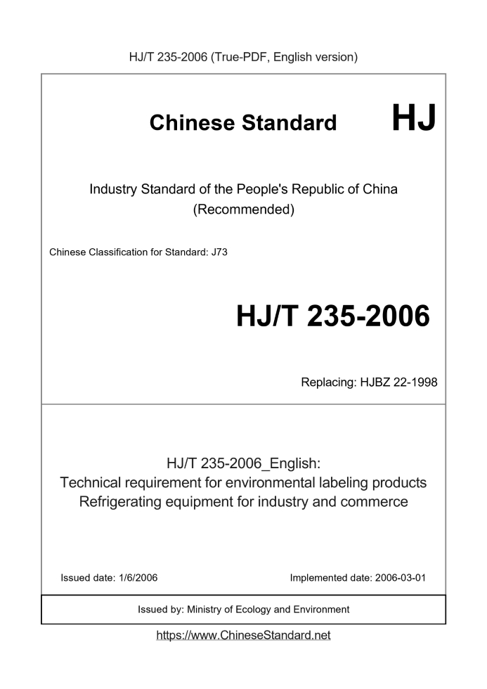 Basic dataStandard ID: HJ/T 235-2006 (HJ/T235-2006)Description (Translated English): Technical requirement for environmental labeling products Refrigerating equipment for industry and commerce Sector / Industry: Environmental Protection Industry Standard (Recommended) Classification of Chinese Standard: J73 Classification of International Standard: 97.130.20 Word Count Estimation: 4,434 Date of Issue: 1/6/2006 Date of Implementation: 2006-03-01 Older Standard (superseded by this standard): HJBZ 22-1998 Regulation (derived from): State Environmental Protection Administration Notice 2006 No. 1; Ministry of Environmental Protection Notice No. 65 of 2012 Issuing agency(ies): Ministry of Ecology and Environment Summary: This standard specifies the category of industrial and commercial refrigeration equipment, environmental labeling product definition, basic requirements, technical contents and test method. This standard applies in addition to all kinds of household refrigeration equipment refrigeration equipment. Tips & Frequently Asked Questions:Question 1: How long will the true-PDF of HJ/T 235-2006_English be delivered?Answer: Upon your order, we will start to translate HJ/T 235-2006_English as soon as possible, and keep you informed of the progress. The lead time is typically in 9 seconds (download/delivered in 9 seconds). The lengthier the document the longer the lead time.Question 2: Can I share the purchased PDF of HJ/T 235-2006_English with my colleagues?Answer: Yes. The purchased PDF of HJ/T 235-2006_English will be deemed to be sold to your employer/organization who actually pays for it, including your colleagues and your employer's intranet.Question 3: Does the price include tax/VAT?Answer: Yes. Our tax invoice, downloaded/delivered in 9 seconds, includes all tax/VAT and complies with 100+ countries' tax regulations (tax exempted in 100+ countries) -- See Avoidance of Double Taxation Agreements (DTAs): List of DTAs signed between Singapore and 100+ countriesQuestion 4: Do you accept my currency other than USD?Answer: Yes. If you need your currency to be printed on the invoice, please write an email to Sales@ChineseStandard.net. In 2 working-hours, we will create a special link for you to pay in any currencies. Otherwise, follow the normal steps: Add to Cart -- Checkout -- Select your currency to pay. |