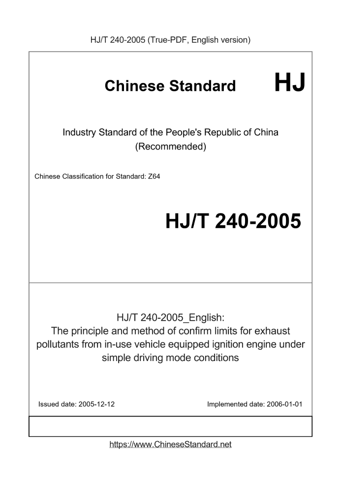 Delivery: <= 3 days. True-PDF full-copy in English will be manually translated and delivered via email. HJ/T 240-2005: The principle and method of confirm limits for exhaust pollutants from in-use vehicle equipped ignition engine under simple driving mode conditions Status: Obsolete