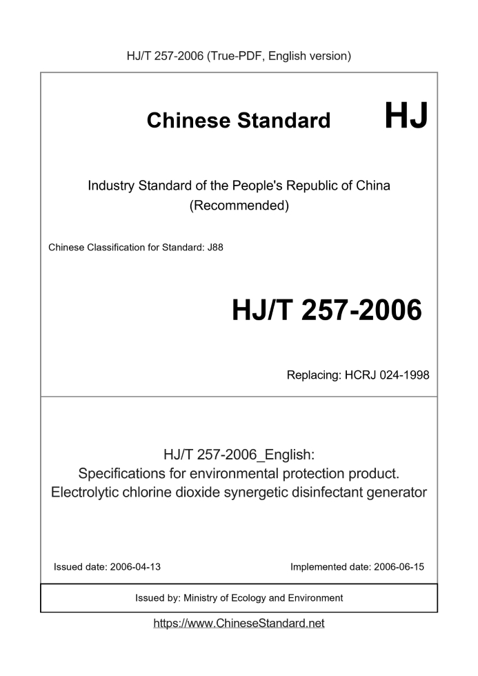 Delivery: <= 3 days. True-PDF full-copy in English will be manually translated and delivered via email. HJ/T 257-2006: Specifications for environmental protection product. Electrolytic chlorine dioxide synergetic disinfectant generator Status: Valid
