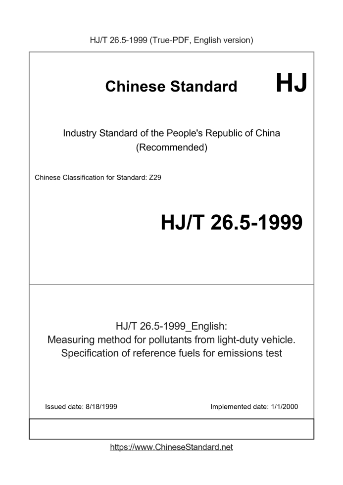 Delivery: <= 2 days. True-PDF full-copy in English will be manually translated and delivered via email. HJ/T 26.5-1999: Measuring method for pollutants from light-duty vehicle. Specification of reference fuels for emissions test Status: Obsolete