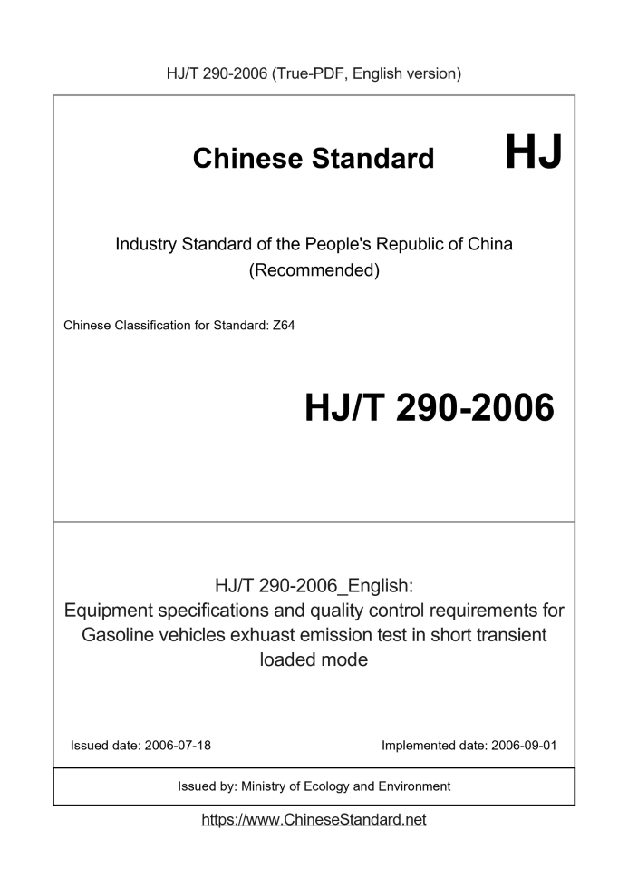 Delivery: <= 10 days. True-PDF full-copy in English will be manually translated and delivered via email. HJ/T 290-2006: Equipment specifications and quality control requirements for Gasoline vehicles exhuast emission test in short transient loaded mode Status: Valid
