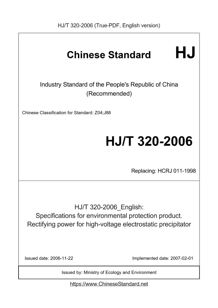 Delivery: <= 2 days. True-PDF full-copy in English will be manually translated and delivered via email. HJ/T 320-2006: Specifications for environmental protection product. Rectifying power for high-voltage electrostatic precipitator Status: Valid