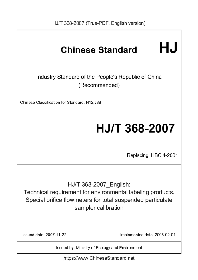 Delivery: <= 3 days. True-PDF full-copy in English will be manually translated and delivered via email. HJ/T 368-2007: Technical requirement for environmental labeling products. Special orifice flowmeters for total suspended particulate sampler calibration Status: Valid