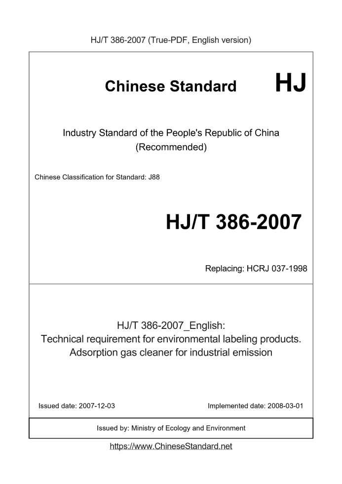 Delivery: <= 3 days. True-PDF full-copy in English will be manually translated and delivered via email. HJ/T 386-2007: Technical requirement for environmental labeling products. Adsorption gas cleaner for industrial emission Status: Valid