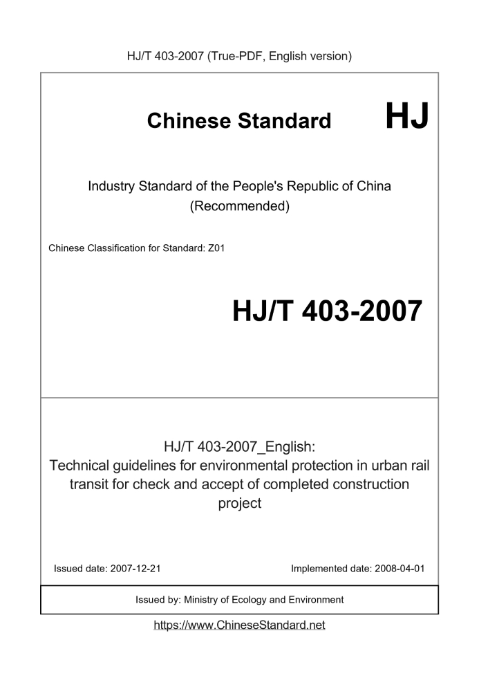 Delivery: <= 5 days. True-PDF full-copy in English will be manually translated and delivered via email. HJ/T 403-2007: Technical guidelines for environmental protection in urban rail transit for check and accept of completed construction project Status: Valid