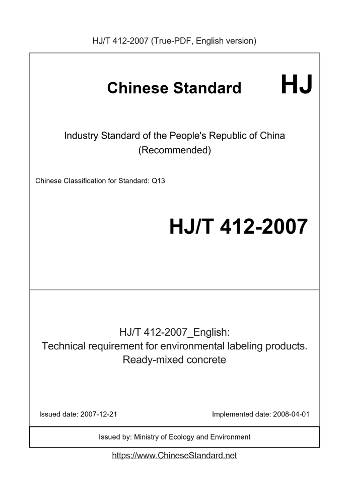 Delivery: <= 3 days. True-PDF full-copy in English will be manually translated and delivered via email. HJ/T 412-2007: Technical requirement for environmental labeling products. Ready-mixed concrete Status: Valid