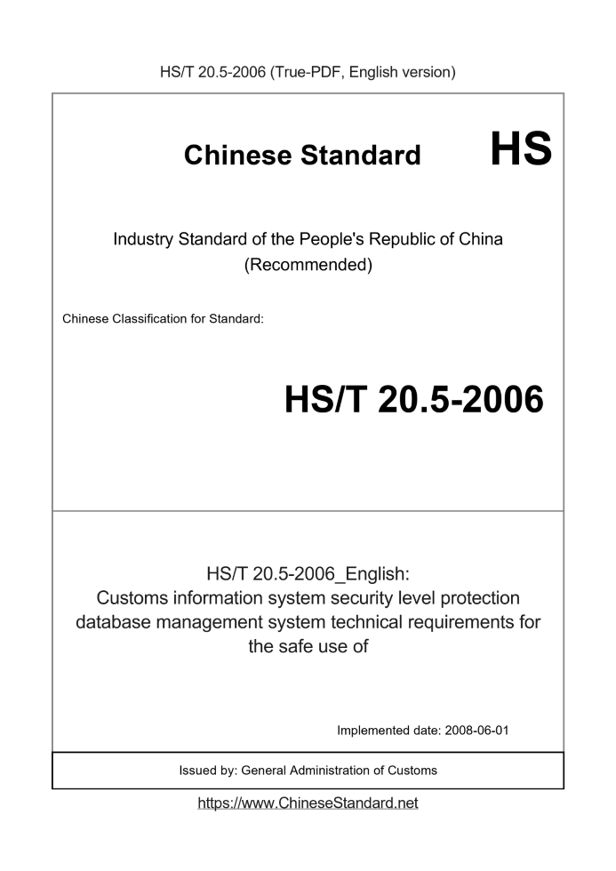 Basic dataStandard ID: HS/T 20.5-2006 (HS/T20.5-2006)Description (Translated English): Customs information system security level protection database management system technical requirements for the safe use of Sector / Industry: Customs Industry Standard (Recommended) Date of Implementation: 2008-06-01 Regulation (derived from): General Administration of Customs Announcement No. 23 of 2008 Issuing agency(ies): General Administration of Customs Tips & Frequently Asked Questions:Question 1: How long will the true-PDF of HST20.5-2006_English be delivered?Answer: Upon your order, we will start to translate HST20.5-2006_English as soon as possible, and keep you informed of the progress. The lead time is typically in 9 seconds (download/delivered in 9 seconds). The lengthier the document the longer the lead time.Question 2: Can I share the purchased PDF of HST20.5-2006_English with my colleagues?Answer: Yes. The purchased PDF of HST20.5-2006_English will be deemed to be sold to your employer/organization who actually pays for it, including your colleagues and your employer's intranet.Question 3: Does the price include tax/VAT?Answer: Yes. Our tax invoice, downloaded/delivered in 9 seconds, includes all tax/VAT and complies with 100+ countries' tax regulations (tax exempted in 100+ countries) -- See Avoidance of Double Taxation Agreements (DTAs): List of DTAs signed between Singapore and 100+ countriesQuestion 4: Do you accept my currency other than USD?Answer: Yes. If you need your currency to be printed on the invoice, please write an email to Sales@ChineseStandard.net. In 2 working-hours, we will create a special link for you to pay in any currencies. Otherwise, follow the normal steps: Add to Cart -- Checkout -- Select your currency to pay. |
