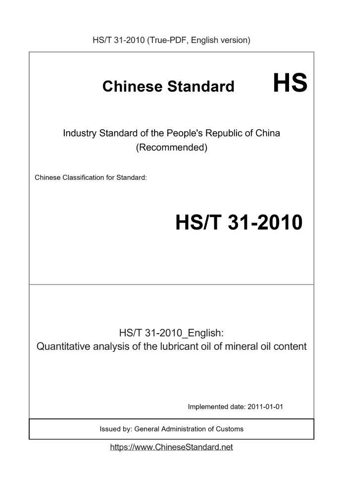 Basic dataStandard ID: HS/T 31-2010 (HS/T31-2010)Description (Translated English): Quantitative analysis of the lubricant oil of mineral oil content Sector / Industry: Customs Industry Standard (Recommended) Date of Implementation: 2011-01-01 Regulation (derived from): Customs Announcement No. 72 of 2010 Issuing agency(ies): General Administration of Customs Tips & Frequently Asked Questions:Question 1: How long will the true-PDF of HST31-2010_English be delivered?Answer: Upon your order, we will start to translate HST31-2010_English as soon as possible, and keep you informed of the progress. The lead time is typically in 9 seconds (download/delivered in 9 seconds). The lengthier the document the longer the lead time.Question 2: Can I share the purchased PDF of HST31-2010_English with my colleagues?Answer: Yes. The purchased PDF of HST31-2010_English will be deemed to be sold to your employer/organization who actually pays for it, including your colleagues and your employer's intranet.Question 3: Does the price include tax/VAT?Answer: Yes. Our tax invoice, downloaded/delivered in 9 seconds, includes all tax/VAT and complies with 100+ countries' tax regulations (tax exempted in 100+ countries) -- See Avoidance of Double Taxation Agreements (DTAs): List of DTAs signed between Singapore and 100+ countriesQuestion 4: Do you accept my currency other than USD?Answer: Yes. If you need your currency to be printed on the invoice, please write an email to Sales@ChineseStandard.net. In 2 working-hours, we will create a special link for you to pay in any currencies. Otherwise, follow the normal steps: Add to Cart -- Checkout -- Select your currency to pay. |