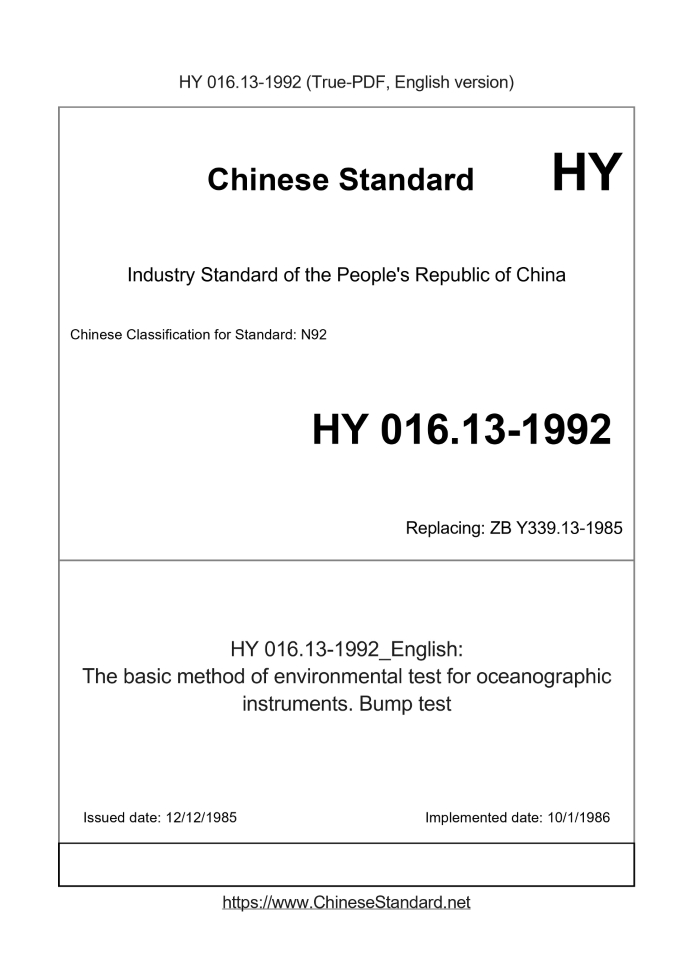 Delivery: <= 2 days. True-PDF full-copy in English will be manually translated and delivered via email. HY016.13-1992: The basic method of environmental test for oceanographic instruments. Bump test Status: Obsolete