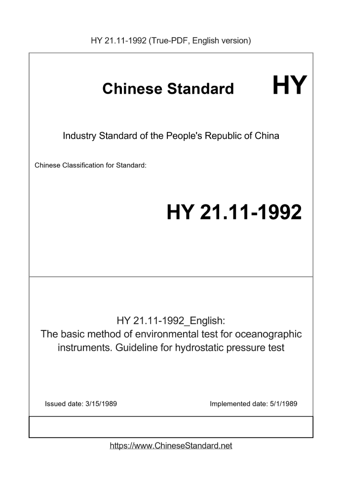 Delivery: <= 3 days. True-PDF full-copy in English will be manually translated and delivered via email. HY 21.11-1992: The basic method of environmental test for oceanographic instruments. Guideline for hydrostatic pressure test