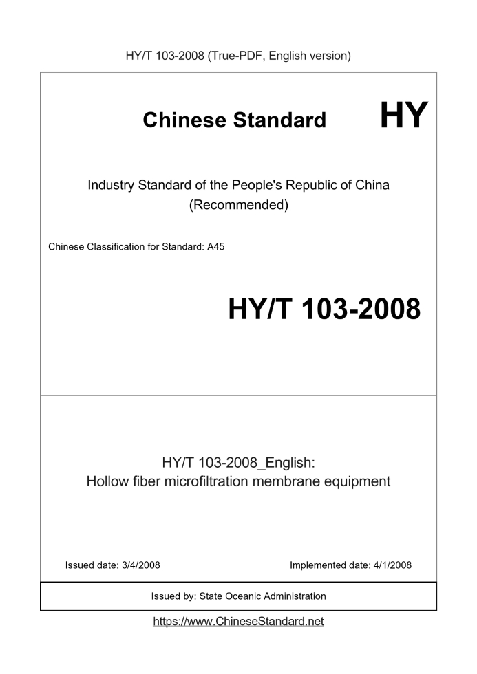 Delivery: <= 3 days. True-PDF full-copy in English will be manually translated and delivered via email. HYT103-2008: Hollow fiber microfiltration membrane equipment Status: Valid