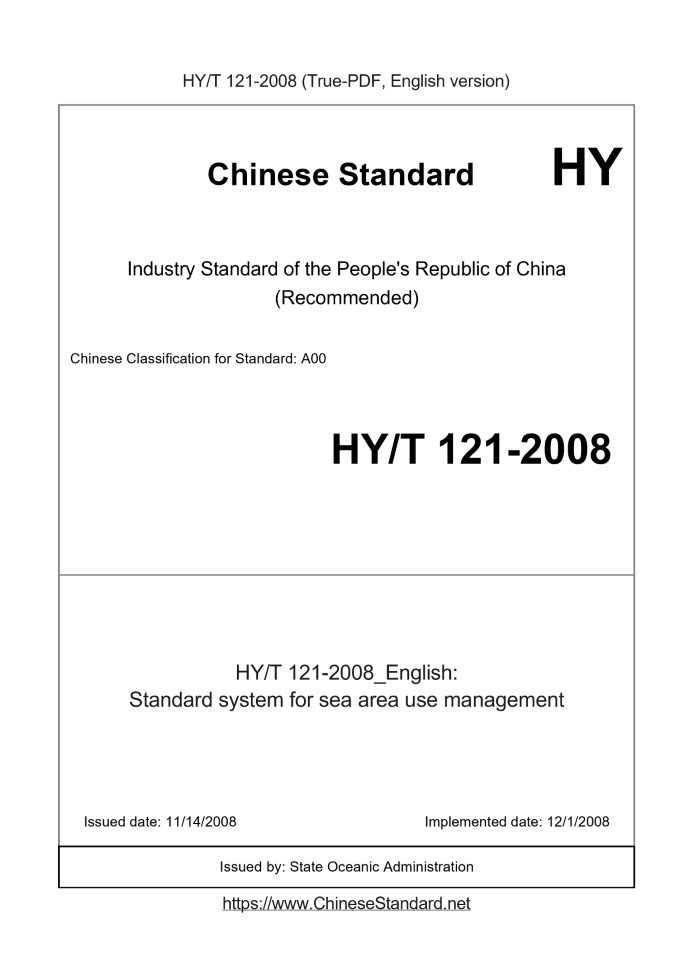 Delivery: <= 3 days. True-PDF full-copy in English will be manually translated and delivered via email. HYT121-2008: Standard system for sea area use management Status: Valid