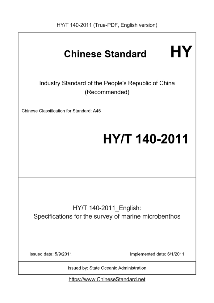 Delivery: <= 6 days. True-PDF full-copy in English will be manually translated and delivered via email. HYT140-2011: Specifications for the survey of marine microbenthos Status: Valid
