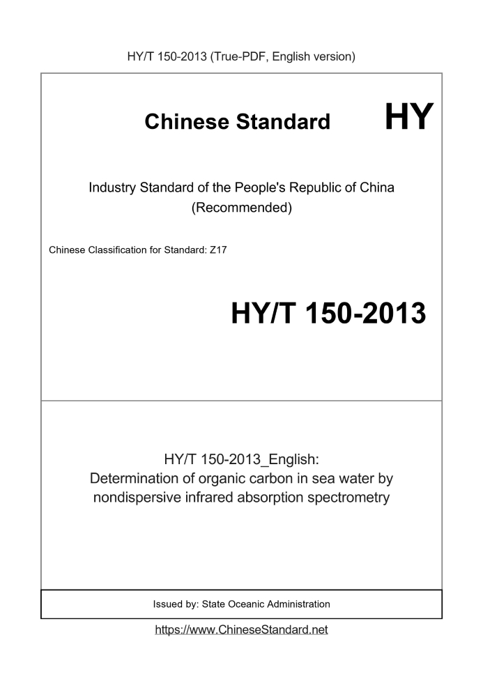 Delivery: <= 3 days. True-PDF full-copy in English will be manually translated and delivered via email. HYT150-2013: Determination of organic carbon in sea water by nondispersive infrared absorption spectrometry Status: Valid