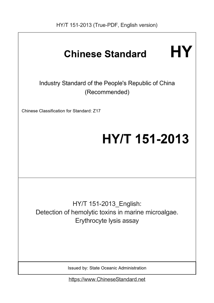 Delivery: <= 3 days. True-PDF full-copy in English will be manually translated and delivered via email. HYT151-2013: Detection of hemolytic toxins in marine microalgae. Erythrocyte lysis assay Status: Valid