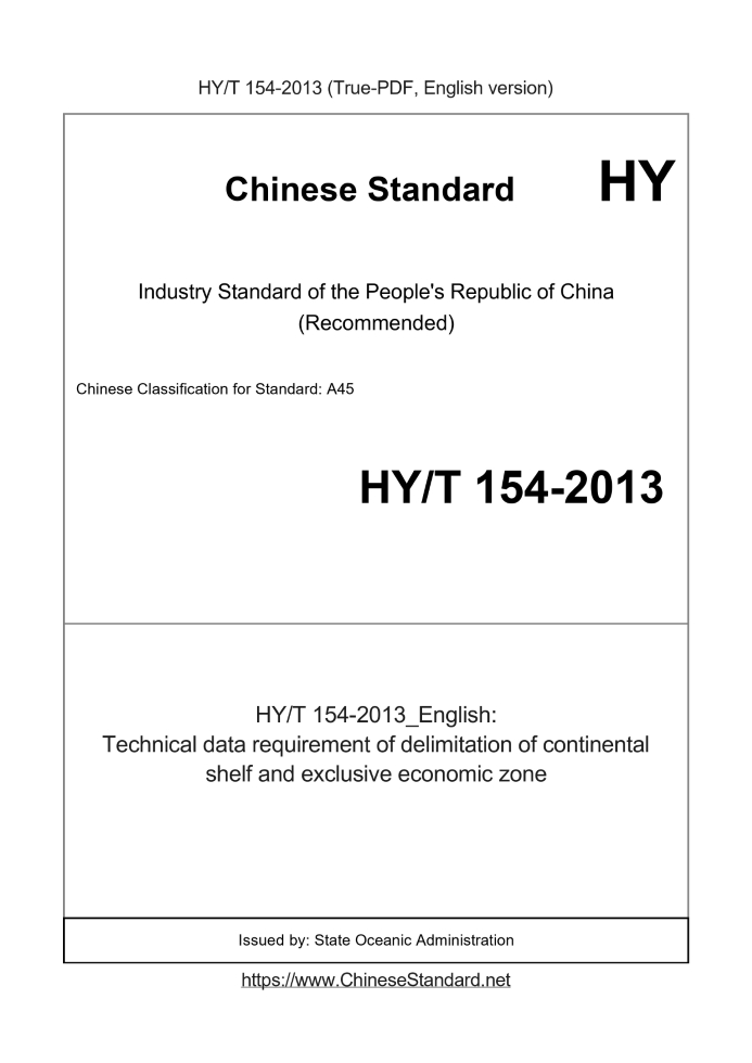Delivery: <= 3 days. True-PDF full-copy in English will be manually translated and delivered via email. HYT154-2013: Technical data requirement of delimitation of continental shelf and exclusive economic zone Status: Valid