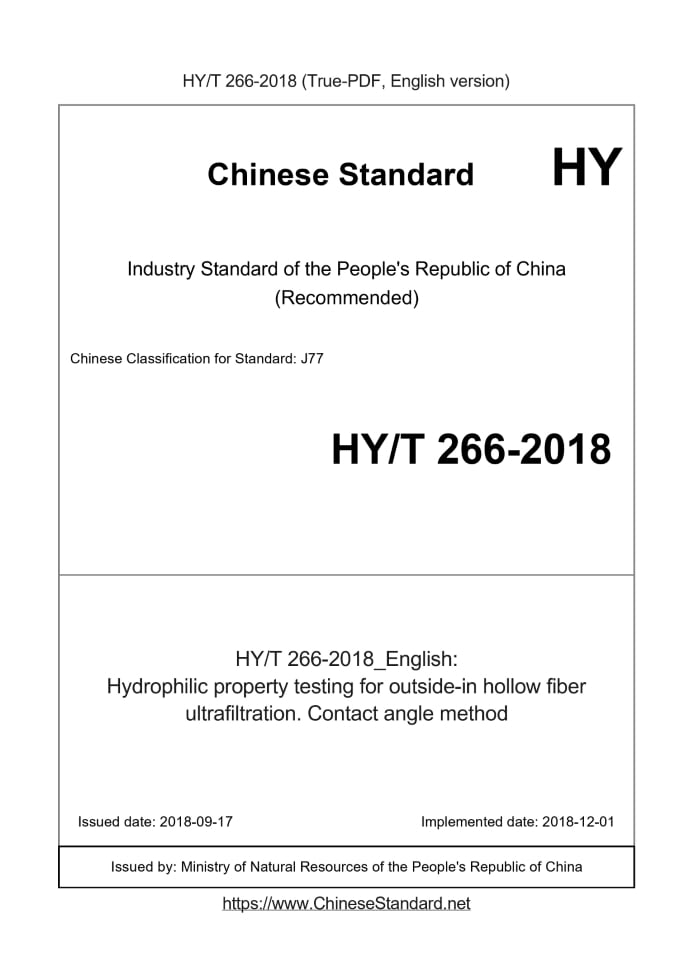 Delivery: <= 3 days. True-PDF full-copy in English will be manually translated and delivered via email. HYT266-2018: Hydrophilic property testing for outside-in hollow fiber ultrafiltration. Contact angle method Status: Valid