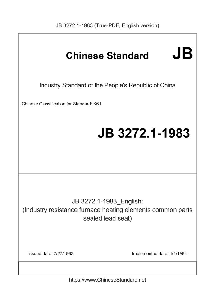 Delivery: <= 2 days. True-PDF full-copy in English will be manually translated and delivered via email. JB 3272.1-1983: (Industry resistance furnace heating elements common parts sealed lead seat) Status: Obsolete