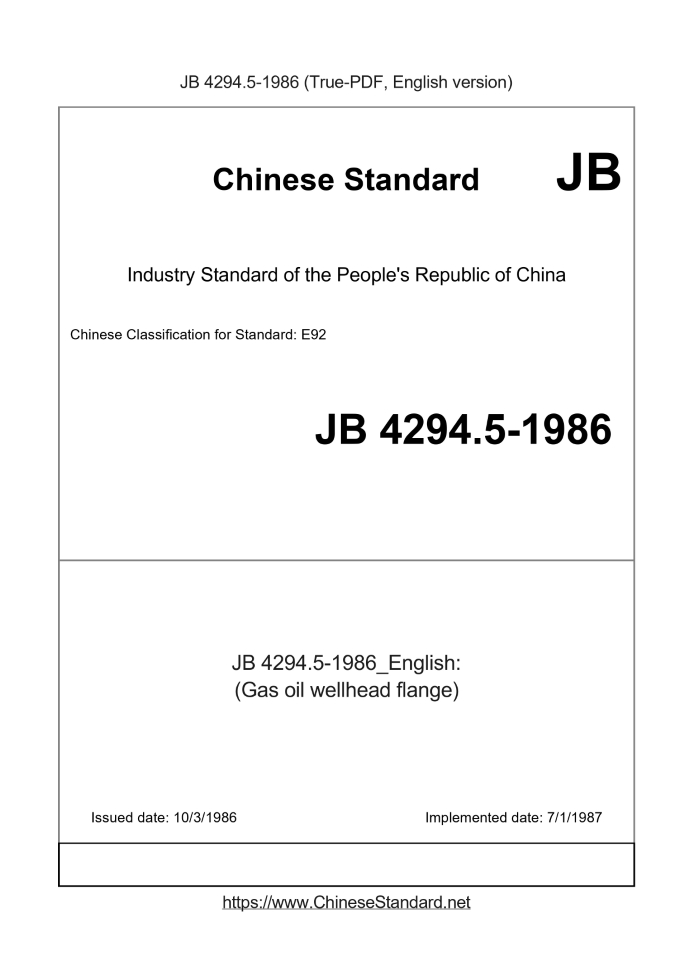 Delivery: <= 4 days. True-PDF full-copy in English will be manually translated and delivered via email. JB 4294.5-1986: (Gas oil wellhead flange) Status: Obsolete