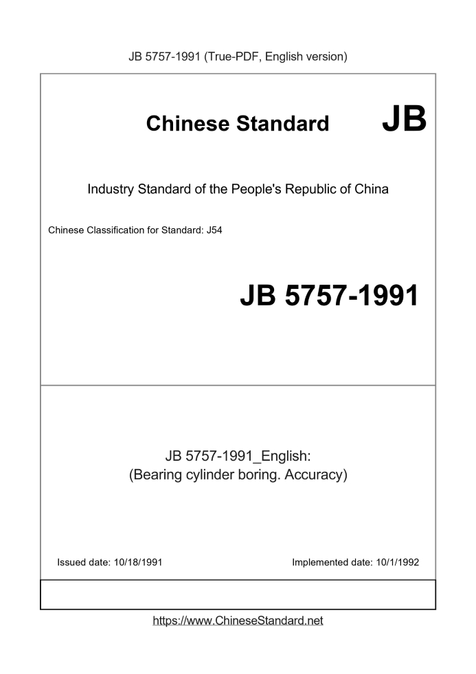 Delivery: <= 2 days. True-PDF full-copy in English will be manually translated and delivered via email. JB 5757-1991: (Bearing cylinder boring. Accuracy) Status: Obsolete