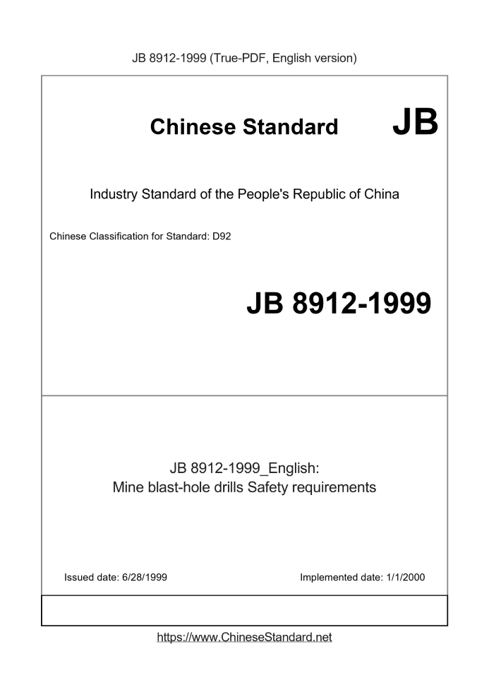 Delivery: <= 4 days. True-PDF full-copy in English will be manually translated and delivered via email. JB 8912-1999: Mine blast-hole drills Safety requirements Status: Obsolete