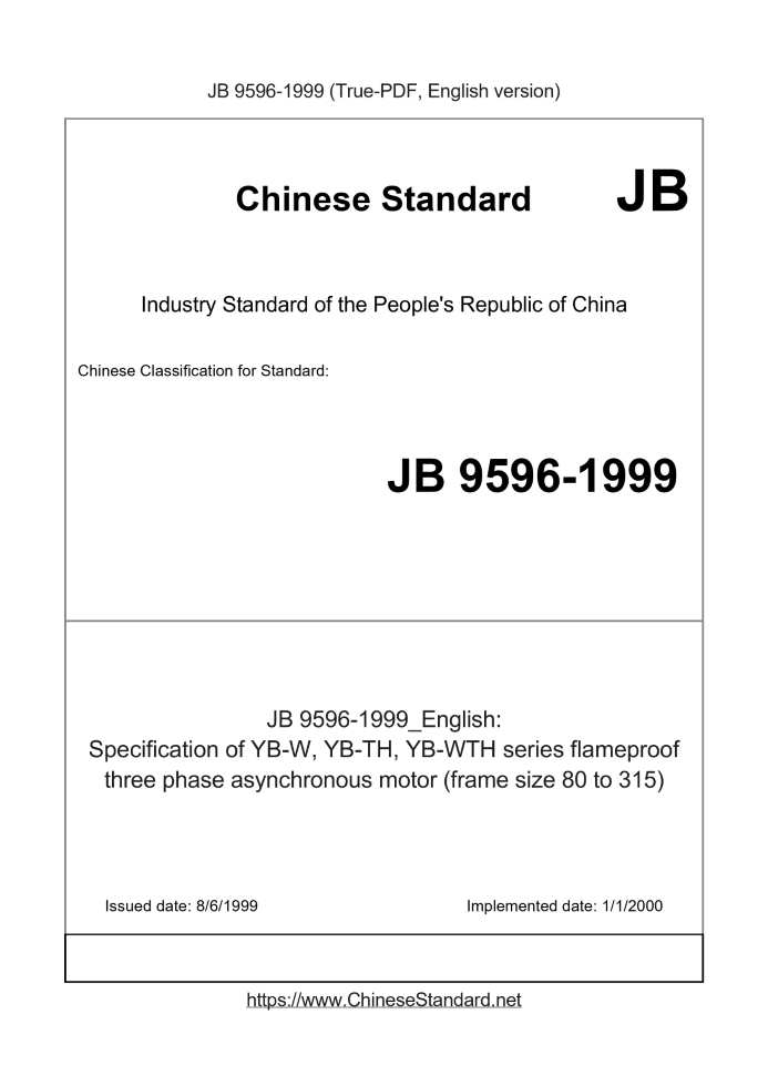 Basic dataStandard ID: JB 9596-1999 (JB9596-1999)Description (Translated English): Specification of YB-W, YB-TH, YB-WTH series flameproof three phase asynchronous motor (frame size 80 to 315) Sector / Industry: Mechanical & Machinery Industry Standard Date of Issue: 8/6/1999 Date of Implementation: 1/1/2000 Tips & Frequently Asked Questions:Question 1: How long will the true-PDF of JB 9596-1999_English be delivered?Answer: Upon your order, we will start to translate JB 9596-1999_English as soon as possible, and keep you informed of the progress. The lead time is typically 1 ~ 3 working days. The lengthier the document the longer the lead time.Question 2: Can I share the purchased PDF of JB 9596-1999_English with my colleagues?Answer: Yes. The purchased PDF of JB 9596-1999_English will be deemed to be sold to your employer/organization who actually pays for it, including your colleagues and your employer's intranet.Question 3: Does the price include tax/VAT?Answer: Yes. Our tax invoice, downloaded/delivered in 9 seconds, includes all tax/VAT and complies with 100+ countries' tax regulations (tax exempted in 100+ countries) -- See Avoidance of Double Taxation Agreements (DTAs): List of DTAs signed between Singapore and 100+ countriesQuestion 4: Do you accept my currency other than USD?Answer: Yes. If you need your currency to be printed on the invoice, please write an email to Sales@ChineseStandard.net. In 2 working-hours, we will create a special link for you to pay in any currencies. Otherwise, follow the normal steps: Add to Cart -- Checkout -- Select your currency to pay. |