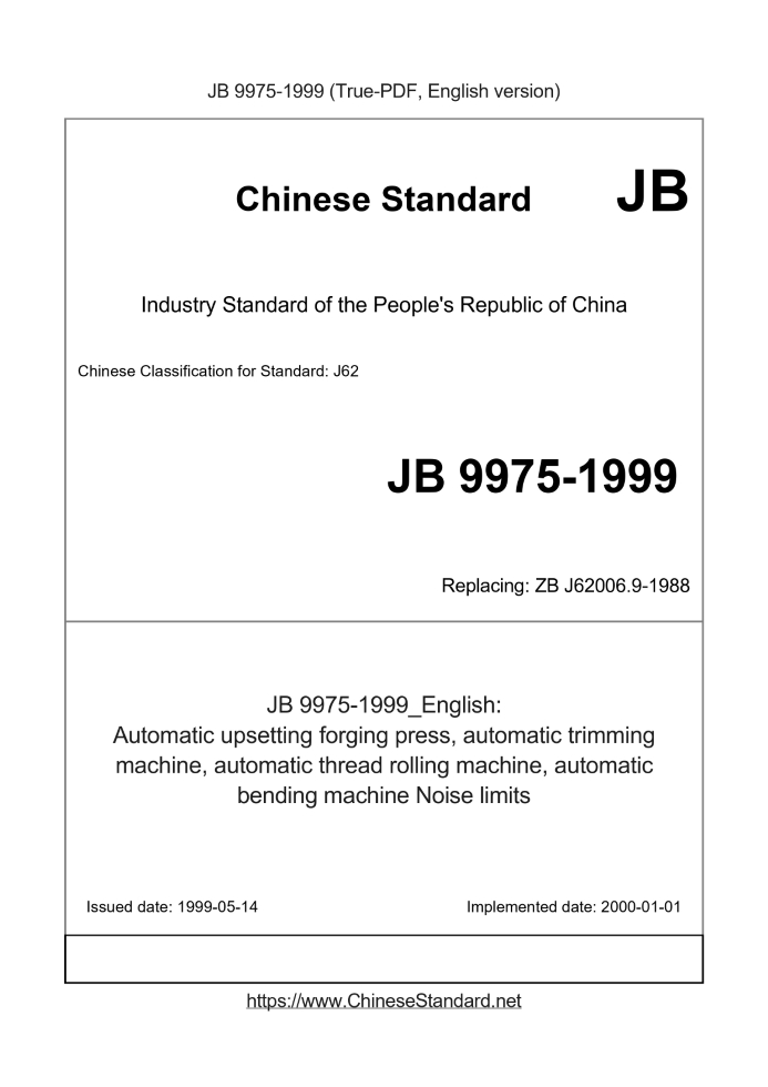 Delivery: <= 3 days. True-PDF full-copy in English will be manually translated and delivered via email. JB 9975-1999: Automatic upsetting forging press, automatic trimming machine, automatic thread rolling machine, automatic bending machine Noise limits Status: Obsolete
