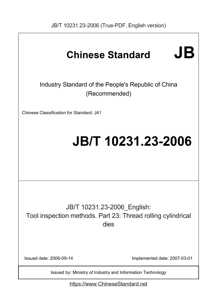 Delivery: <= 3 days. True-PDF full-copy in English will be manually translated and delivered via email. JB/T 10231.23-2006: Tool inspection methods. Part 23: Thread rolling cylindrical dies Status: Valid