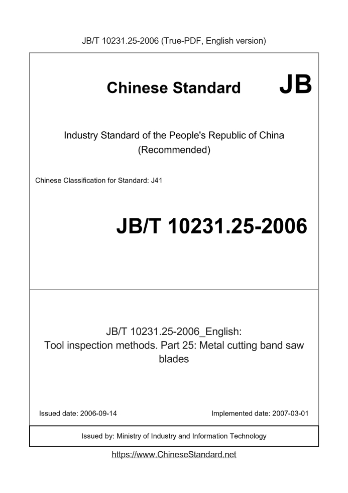 Delivery: <= 3 days. True-PDF full-copy in English will be manually translated and delivered via email. JB/T 10231.25-2006: Tool inspection methods. Part 25: Metal cutting band saw blades Status: Valid