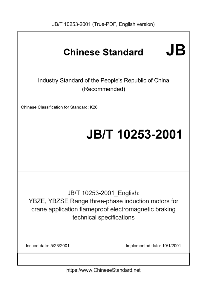 Delivery: <= 6 days. True-PDF full-copy in English will be manually translated and delivered via email. JB/T 10253-2001: YBZE, YBZSE Range three-phase induction motors for crane application flameproof electromagnetic braking technical specifications Status: Obsolete