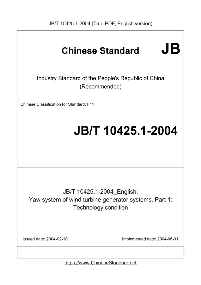 Delivery: <= 3 days. True-PDF full-copy in English will be manually translated and delivered via email. JB/T 10425.1-2004: Yaw system of wind turbine generator systems. Part 1: Technology condition Status: Valid
