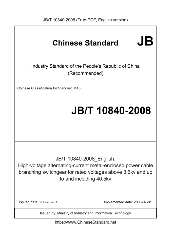 Delivery: <= 5 days. True-PDF full-copy in English will be manually translated and delivered via email. JB/T 10840-2008: High-voltage alternating-current metal-enclosed power cable branching switchgear for rated voltages above 3.6kv and up to and including 40.5kv Status: Valid