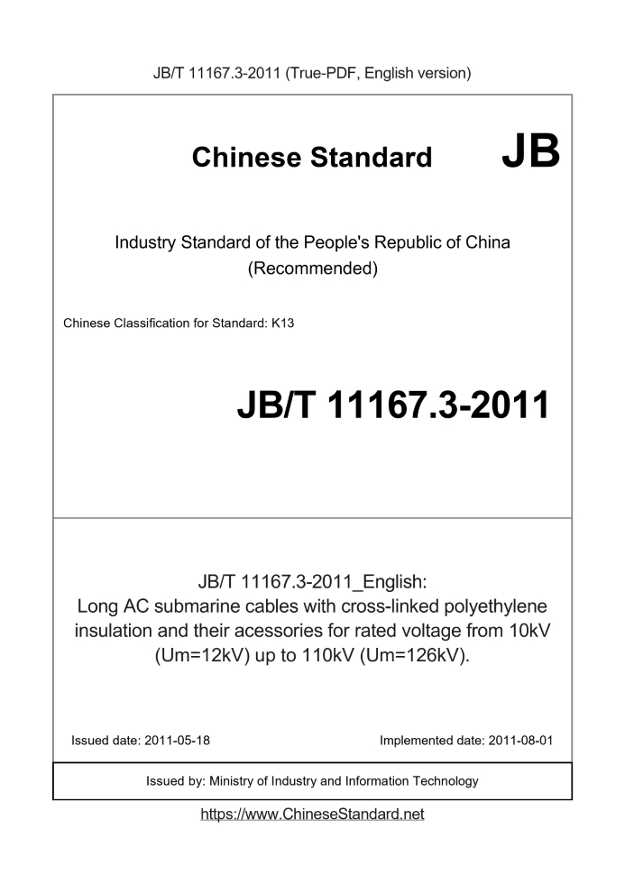 Delivery: <= 3 days. True-PDF full-copy in English will be manually translated and delivered via email. JB/T 11167.3-2011: Long AC submarine cables with cross-linked polyethylene insulation and their acessories for rated voltage from 10kV (Um=12kV) up to 110kV (Um=126kV). Status: Valid